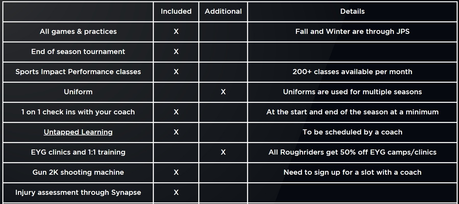 One of the benefits to being part of the RoughRiders program is that we provide a well-rounded offering for your athlete. We have everything under one roof and you never have to worry about whether your team will have practice time/space because Sport Stable works exclusively with RoughRiders.
